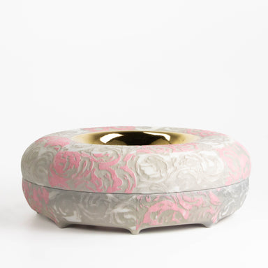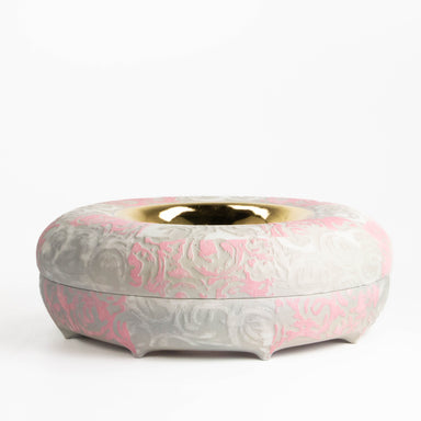 This circular, halo-shaped box is made of Grolleg porcelain, colored porcelain, rare earth glaze, and gold. It measures 4 x 11.5". Please reference...