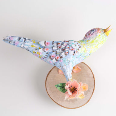 This papier-mache bird is flying happily along. Painted and mounted on a slice of wood to hang on a wall this piece measure 6" x7" x7". Please refe...