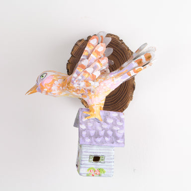 This papier-mache bird is flying happily along carrying its home wherever it goes. Painted and mounted on a slice of wood to hang on a wall this pi...