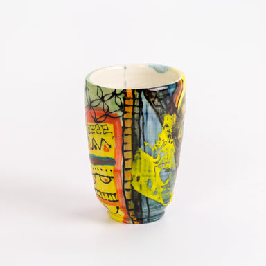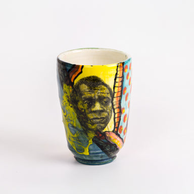 This tumbler has a bright decorative pattern across its surface, featuring a decal of James Baldwin. It measures 4.75 x 3.25” and is a made of porc...